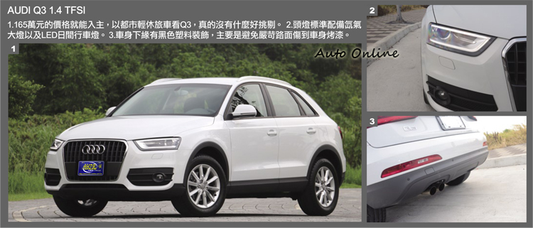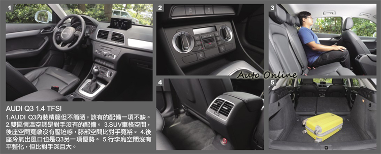 AUDI Q3車格屬較正統SUV,駕駛者視野、後座乘坐空間相當寬裕,座椅設定泡棉舒適,支撐性也很好,後座椅背角度適中,但頭枕會將乘客頭部略略前頂,除非坐姿非常端正,不然會感覺有點不太舒適。後座有冷氣出風口,炎炎夏日對後座乘客影響很大。後座中間沒有中央扶手,對於有些喜歡靠手的乘客會感到小不便。至於懸吊,Q3車身重心較高、懸吊偏軟,遇到坑洞吸震能力強,傳至車內震動輕微,但如果高速行駛,重心高、懸吊偏軟,側傾明顯,乘客容易暈車。