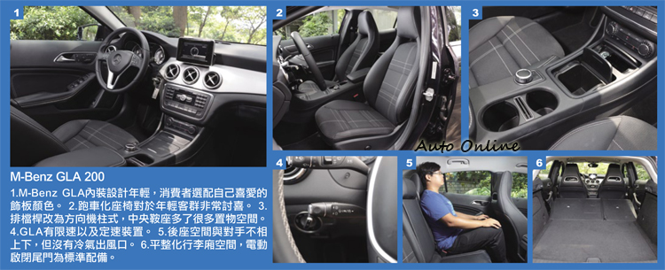 今年才剛上市的M-Benz GLA,沒有因為產品較新就占到便宜,配備部分就略感陽春一點。冷氣空調還是手動溫度控制,前座電動椅調整只有駕駛座,後行李廂空間也比對手小了一點,後座未傾倒421公升,傾倒後有1235公升。但是在整體內裝設計,GLA走的是時尚風格,消費者能選配車內喜愛的飾板,雙前座跑車型座椅,排檔桿改方向機柱式,中央鞍座多了很多置物空間,中控台上方螢幕配合AUDIO 20旋鈕操作,螢幕一樣只有英文顯示(儀表板中間顯示幕有中文化),後行李廂尾門標準配備電動啟閉等。現在的車設計有一好沒兩好,如果能將雙方優點合併,我想這車應該就無敵了。