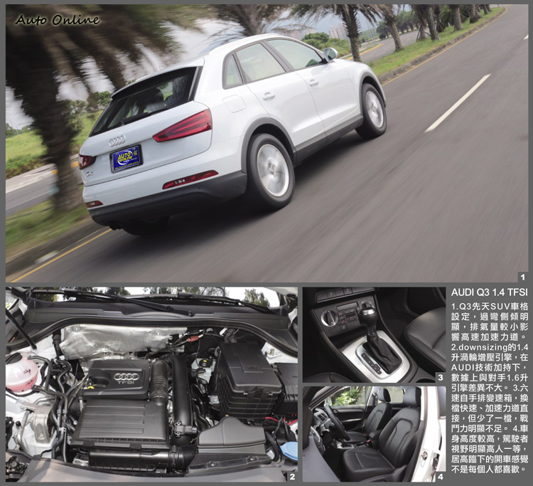 AUDI順應潮流研發出downsizing引擎,AUDI Q3 1.4 TFSI入門車型換上1.4升渦輪增壓引擎,用以往科技來看,1.4升想要推動一輛重達1.4噸的Q3,後果可想而知。但是AUDI利用渦輪增壓技術與缸內直噴,排氣量雖然小,馬力輸出可有150匹的實力,25.5公斤米最大扭力,配上六速自手排變速箱,起步到中速時的加速力道飽滿,隨著轉速、車速拉高,後面的力道就會減緩,如果行駛進陡峭的山區,1.4的動力就稍嫌不夠,不過以都市用車的環境,1.4升引擎動力已經夠用。