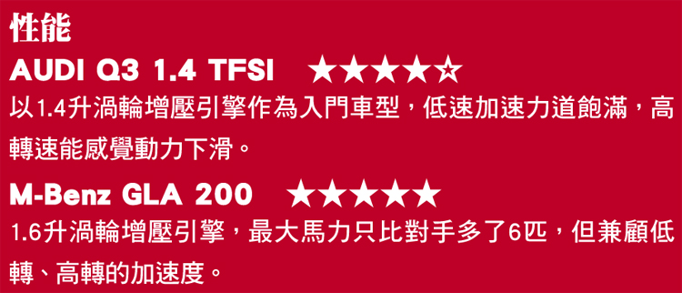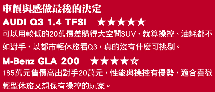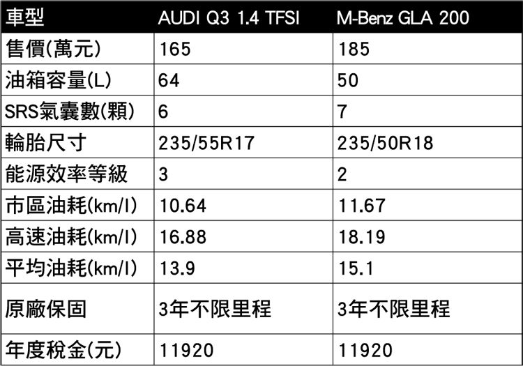 AUDI Q3 1.4 TFSI與M-Benz GLA 200售價上相差20萬元,車型定位Q3較屬於正統SUV,而GLA比較屬於新世代跨界SUV。不過引擎性能、傳動方式、車內空間兩者差異些微,所以這次就是要在些微差異中,去尋找占優勢的地方。其實同等級對手中還有BMW X1,但因為車廠沒有試乘車可借,所以缺席這次評比,但我們還是會在文中,盡可能把X1的優勢也納進去。
