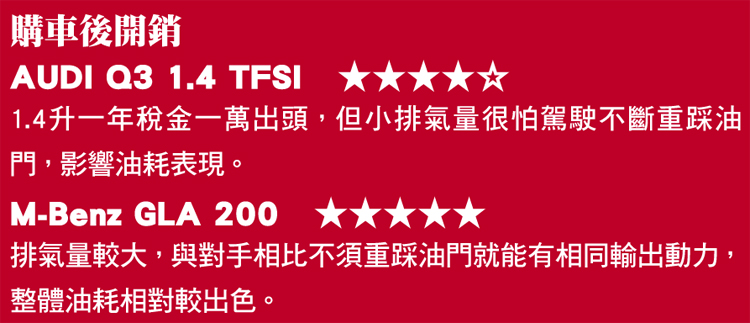 Q3與GLA在一年的稅金兩者都在同一個級距內,所以之後每年所要負擔的金額相同,但是1.6升的GLA在一般人觀念裡有較大優勢,可以得到較有利的動力輸出。油耗方面,Q3因為引擎排氣量較小,要負擔休旅車的車重,油耗方面趨於弱勢,市區油耗10.64km/l、高速油耗16.88km/l及平均油耗13.9km/l,看似不錯但與對手GLA相比,GLA市區、高速、平均油耗分別為11.67km/l、18.19km/l、15.1km/l,輕易就能分辨誰有較優異表現。Q3影響油耗最大因素排氣量較小與變速箱檔位所致,購車後的油錢,Q3相對要比對手付出較多代價。