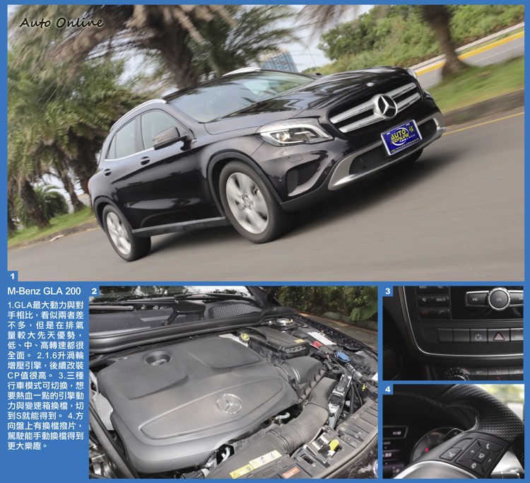 GLA有類似休旅車的外觀造型,但體內住的還是轎車的靈魂。基本設定與自家A-Class相同,只在懸吊部分增加高度,提高車身與地面高度,能避免爛路傷到底盤。增加的高度不高,所以操駕感受趨近轎車風格,只是側傾明顯一點點,駕駛者視野沒有因為車身變高而覺得寬闊,還是以轎車的呈現方式。GLA行車模式有S運動、M手動、E節能三種模式,會改變油門與變速箱反應,想要熱血切換到S會有不一樣的駕馭風格。與對手以相同的速度過彎,GLA側傾幅度明顯較小,有更穩定的車身動態毋庸置疑。與對手相同一樣只有配置前輪驅動,遇到泥濘、嚴苛路面還是先想清楚再往前開。