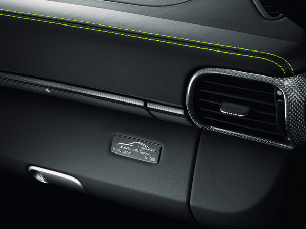 ![]() ▲911 Turbo S “Edition 918 Spyder”為了縮短車主們等待918 Spyder的時間,保時捷特別提供他們獨家訂購911 Turbo S “Edition 918 Spyder”的專屬機會,同樣限量918台。不論外觀或是內裝,這款特別車型處處可見918 Spyder的特色與設計元素。獨特的檸酸綠點綴於車型字樣、座椅縫線、儀錶板指針、PCM螢幕以及自體發光車門檻飾板。彰顯限量生產序號的銘牌位於手套箱上方,車主的911 Turbo S “Edition 918 Spyder”也可選擇與918 Spyder相同的車色。