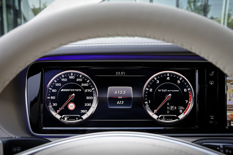 7G-TRONIC七速手自排變速箱提供 Controlled Efficiency (C)、Sport (S)與Manual (M)三種模式。在M/S模式下動力的輸出與換檔反應都更為精準迅速,帶來如跑車般的狂野換檔節奏。C模式則是偏重節能與舒適的行路性,怠速自動熄火功能也只在這個模式下運作。雖然動力輸出數據嚇人,不過歐盟NEDC油耗測試的平均油耗數據為23.7mpg,可說是全球最節能的市售V12引擎高性能房車,廢氣排放也通過了EU6歐洲六期廢氣排放標準。