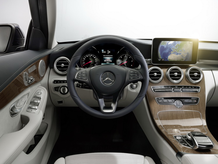 前方控台造型延續了M-BENZ最近的設計風格走向,跟剛發表不久的CLA-Class四門Coupe相當接近,有著流動的美感是最大的特色,而三輻式方向盤與五個圓形空調出風口也都脫不了CLA的影子,不過C-Class的產品定位比CLA高,所以不管是在材質的選用與細部的處理上都有著更好的質感,以金屬的冷冽搭配木料或皮革的溫暖質感來形成對比,旋鈕控鍵則採3D立體造型設計猶如許多小精品點綴於豪華的車室中。