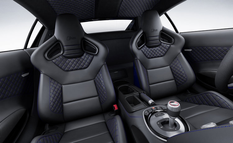![]() ▲車尾採用固定式尾翼,藉以提高後軸下壓力。外型方面,R8 LMX在前後及車側裙腳、擾流翼和引擎飾蓋等處使用碳纖製品,並採用固定式後尾翼提供後軸更大的下壓力,並配備19吋輪圈和紅色卡鉗、陶瓷碳纖煞車碟盤,同時提供專屬藍色、灰色與黑色車漆的選項。 ![]() ▲內裝同樣採用藍色作為主題顏色,與它的雷射技術相呼應。