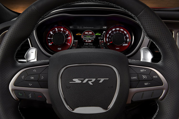 ![]() Challenger SRT Hellcat的輪圈使用七幅20吋鍛造鋁圈,搭配P275/40ZR20 Pirelli P Zero Nero輪胎,配合390mm碟盤與Brembo前六活塞卡鉗煞車系統,進一步強化它的制動性能。至於內部則有相當現代感的格局設計,譬如8.4吋觸控螢幕、皮革包覆和鋁質飾條,7吋駕駛儀表多功能顯示幕還能模擬1971年的Challenger。