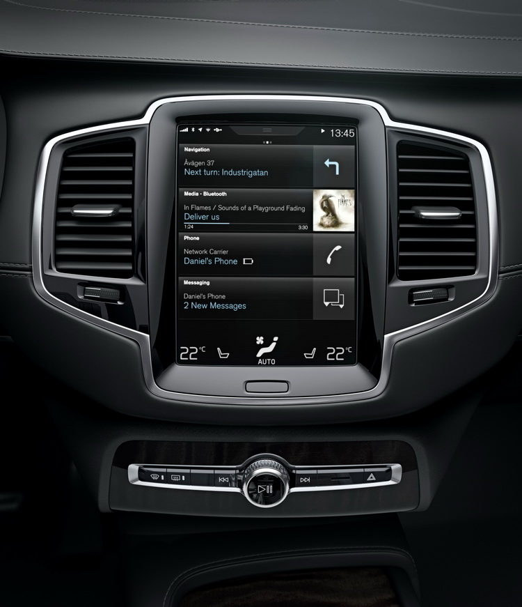 而在內裝方面,新XC90也以超越過去車款的豪華表現為開發目標,車內鋪陳材質不管是木料或皮革都是精挑嚴選,將斯堪地那維亞的風格帶向新境界。其中相當有特色的就是排檔桿部分特別請到了瑞典著名的紅酒香檳酒杯製造商Orrefors以水晶玻璃來製作。另外在引擎起動鍵與音響系統的音量控制鍵也採用鑽石切削製成,中控台的中央則是配置有如平板電腦一般的大型觸控螢幕,將各種行車資訊及影音娛樂集中於一處,大幅簡化各類操作按鈕的數量。