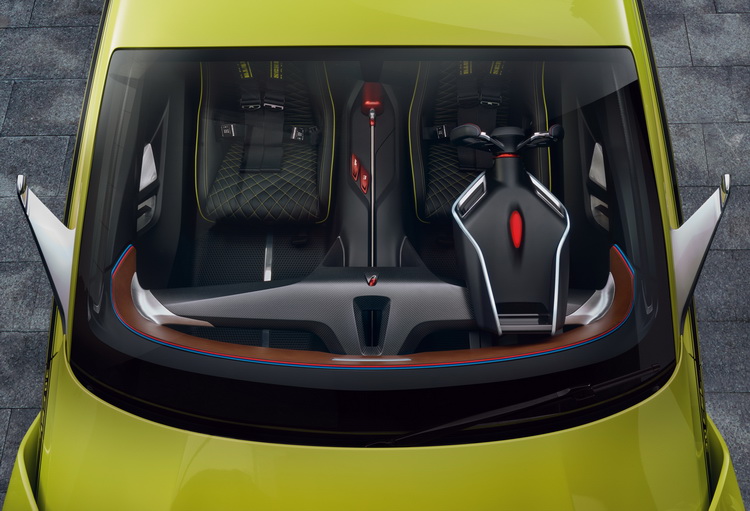 而在充滿賽車競技感的車室內,大部分內裝細節都是以CEFP材質所製成,唯一的「木料質感」來自於前方控台上的木紋飾板,中間則是eBoost充電資訊顯示幕,儀錶板設計也是盡量簡約,提供檔位、引擎轉速與換檔時機點等資訊。車內其他競技專用配備包括了賽車桶椅、六點式安全帶與前座中央的滅火器,車後還有專門收納固定安全帽的地方。