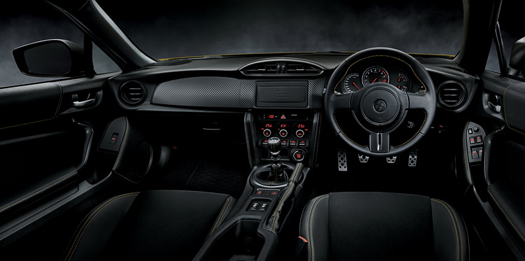 這部以日規86 GT車型為基礎的限量特式車除了車身是專用的「日出黃」車色外,以黑色為主調的車室內部中,也可以在座椅、方向盤等處看到黃色縫線,醞釀更為濃厚的運動氛圍。此外,座椅採用真皮搭配Alcantara類麂皮包覆製成,儀錶板上方的遮光罩同樣採用Alcantara皮革,提升整體質感。