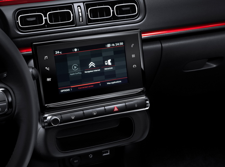 車室內裝用料與配色參考了旅遊用品與居家裝潢的設計,全景玻璃車頂帶來明亮的採光;七吋觸控式中控台螢幕將車內主要系統功能皆整合於此來操作。新C3還首度導入稱為「ConnectedCAM Citroen」的輔助系統,透過整合於後視鏡後方的攝影鏡頭,來拍攝照片即時上傳至社群網站,或是作為行車記錄器拍攝行車畫面。而包含聲控功能的3D衛星導航、後視顯影、車道偏離輔助與視覺盲點監測警示等駕駛輔助系統也都在選配名單之中。
