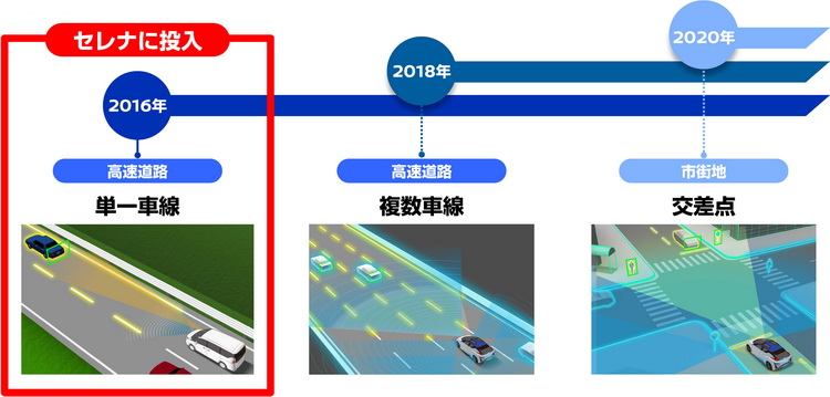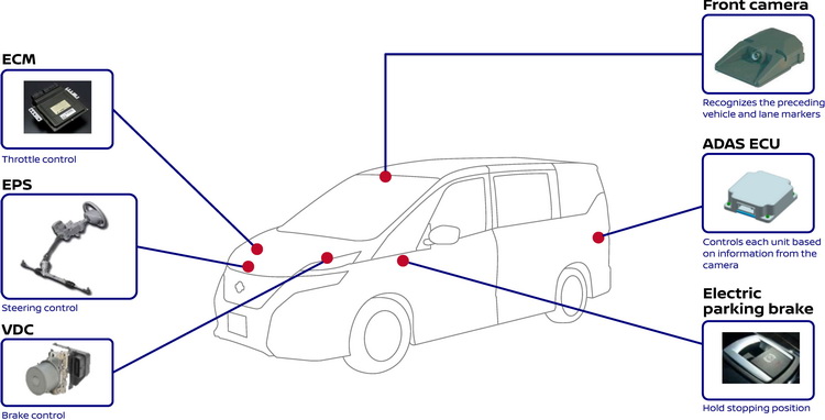 開車時,駕駛者只需要藉由方向盤的按鍵就可以啟動與設定ProPILOT,中控台螢幕會切換為系統運作狀態顯示。車上所配置的攝影機具影像處理機能,可以立即偵測判斷出道路前方車輛與白線等物體,迅速以所偵測到的訊息進行判斷並控制方向盤及油門、煞車,讓車輛與前車保持在所設定的距離並維持走在車道線之內。