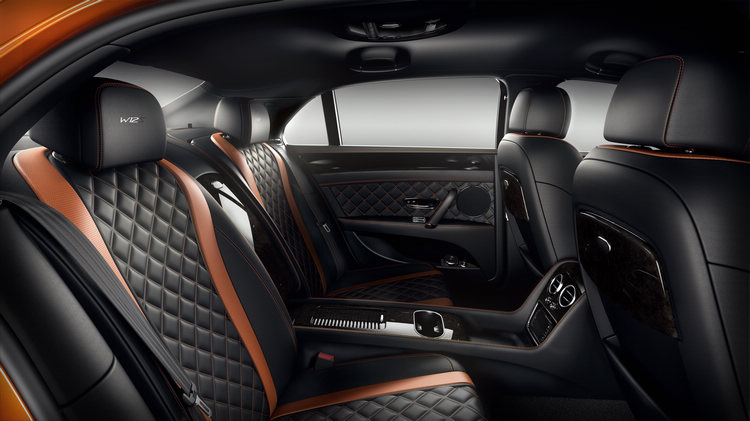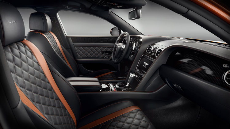 座艙內,Flying Spur W12 S採用了一系凸顯運動氣息、奢華風範和優雅氣質的裝飾設計元素,精緻手工內飾提供更多顏色選項、全新的儀表板表面和獨特的縫線。內飾特色設計包括儀表板和腰樑上獨特的黑色引擎旋轉圖案外觀、採用對比色縫線或隱形縫線的W12 S頭枕徽標、W12 S前後門邊迎賓踏板、三輻Sport+ 方向盤和滾花換檔撥片。