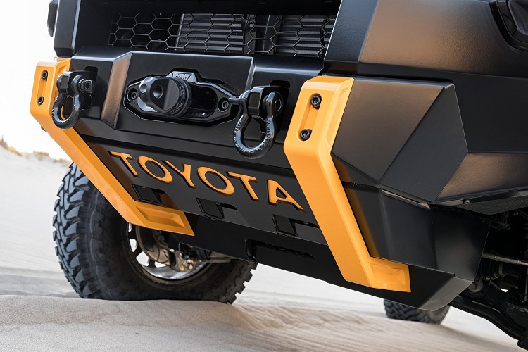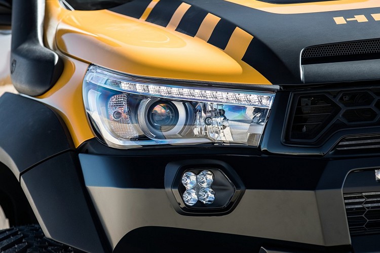 ![]() 外觀部分,換上碳纖維凸起外加進氣孔引擎蓋,前保桿被鐵材質競技桿取代,上面有LED探照燈加強夜間照明,另外車頭絞盤、拖車鉤也不能少。越野時最怕石頭異物碰壞引擎底部,Toyota幫它加裝了6mm厚度的鋁合金護板來保護油底殼與重要部件。車側前後加大輪拱,視覺震撼被予以強化,輪胎為35吋規格;車頂一樣有長條型LED探照燈,眼前從此一片光明。車尾貨斗已與市售車完全不同,固定了一只備胎、工具盒、副油桶、千斤頂與滅火器等工具。