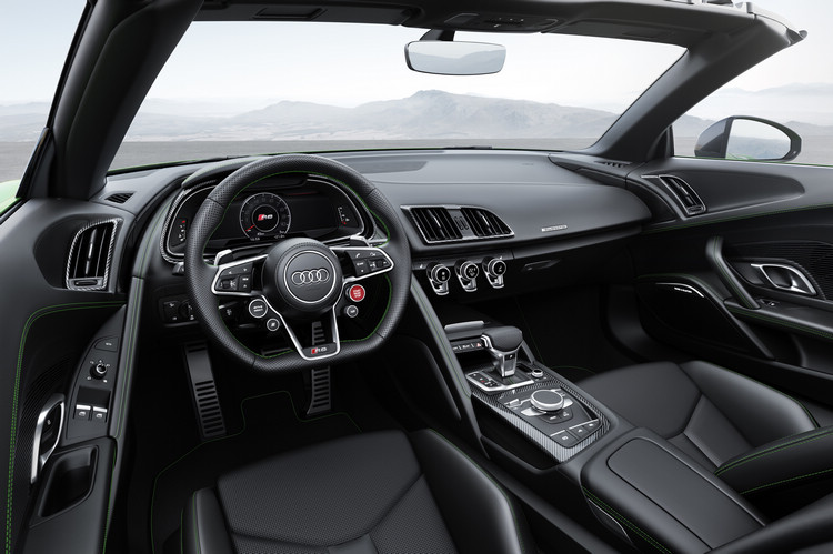 ![]() 由於標配一體成型座椅、鍛造輪圈、碳纖陶瓷煞車系統等緣故,R8 Spyder V10 plus比起一般版本的R8 Spyder重量更輕25kg,淨重只有1695 kg。車內配置12.3吋虛擬駕駛座艙以及MMI導航資訊娛樂系統等標準配備。R8 Spyder V10 plus同時也可選擇專屬的「蜘蛛綠」車色套件,除了外觀烤漆顏色之外,氣氛燈和縫線都施以鮮艷的綠色作為搭配,相當搶眼。