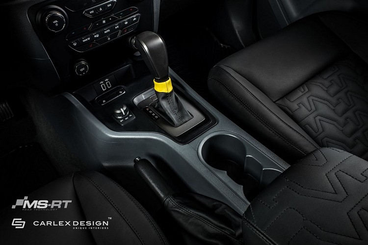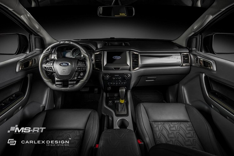 ![]() Ford Ranger是一輛針對北美市場以外所設計的貨卡,所以在車身尺寸上比起F-150小巧許多。這次由兩家公司聯手改造了Ranger,首先從內裝來看,車身座椅、方向盤等多處選用了Nappa皮革,增加車內質感氛圍。另外,飾板部分刻意改用黑色塗裝,注入些神秘感;其中最重要的VR-46標誌以及專屬黃色,在車內多處也能看到。