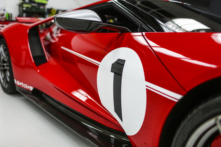 GT `67 Heritage edition特式車有著鮮豔的亮紅色車身,搭配美式肌肉車常見,貫穿全車中央的白色線條,再加上碳纖維空力件。引擎蓋上與車輪後方都有底黑字的「1」號車號。腳上則是20吋單件式鋁圈搭配紅色煞車卡鉗,後視鏡外殼則漆上銀色在視覺上更顯突出。