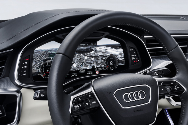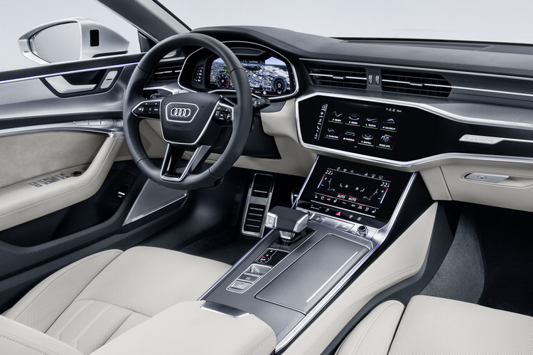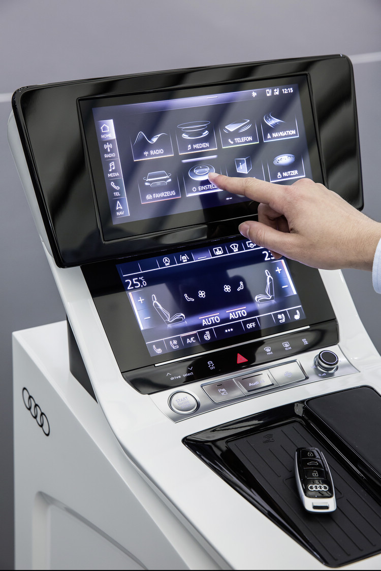 Audi全新家族簡潔俐落的內裝陳列,也在新一代A7首次展現,雙觸控螢幕的中控台設計,取代了傳統MMI娛樂系統實體旋鈕按鍵,徹底實現按鍵極簡化的概念。雙螢幕整合了多項車載娛樂及資訊功能,同時當手指點擊觸控螢幕功能鍵時還能感受如實體般細緻的按鍵回饋感。
