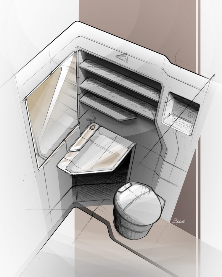 在寬敞的車室空間內,這部露營車採用了明亮的內裝色調,且不但有臥房區讓乘客躺在床上休息、有廚房區方便烹煮料理、有廁所解決大小便問題,還有淋浴間可以讓乘客洗澡,在野外也能保持身體清潔舒爽。空間規劃井然有序且聰明有效率。