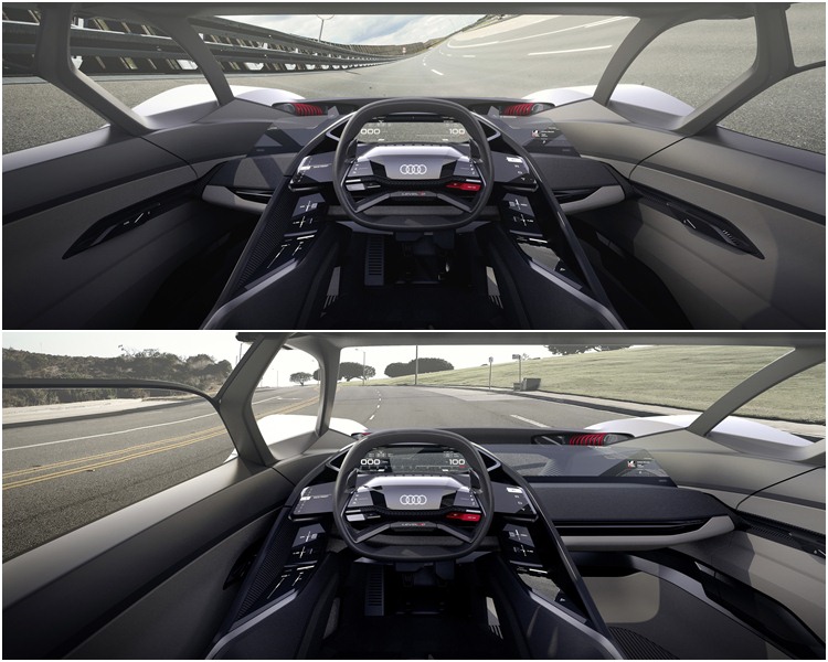 ![]() ▲高度的座艙數位化程度,將是未來Audi純電車款的預演。超大擋風玻璃內部也有名堂,它其實是一個透明的OLED,透過電腦分析可即時顯示理想的進彎路線,而導航和其他電子設備的資訊也能在此呈現,並可於賽道或道路的不同模式之間切換。