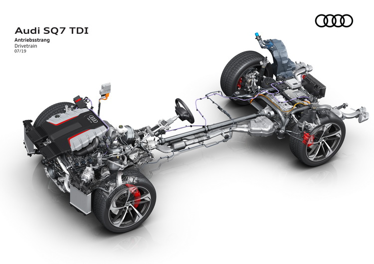 AUDI S家族中比較新的車款如S4、S5、S6、S7 Sportback與SQ8在歐洲皆已換裝高性能柴油引擎,現在SQ7也跟進換裝,搭載4.0升V8雙渦輪柴油引擎,可輸出435hp最大馬力與91.8kgm/1250-3250rpm最大扭力。是目前歐洲市場同級柴油引擎最強的輸出規格。搭配八速Steptronic手自排變速箱與Quattro四驅系統,0-100km/h加速成績4.8秒,極速被電子限速於250km/h。