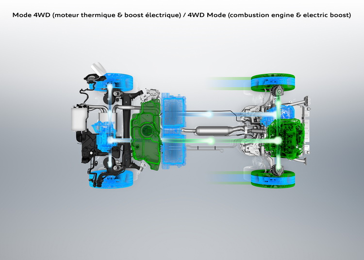 3008 GT Hybrid4車型在引擎部分是搭載1.6升排氣量Puretec直列四缸汽油渦輪引擎,具有200hp最大馬力輸出。電動馬達則是前後軸各配置一個,最大馬力輸出均為110hp,綜效最大馬力則為300hp。也讓它的0-96km/h加速成績來到5.9秒。