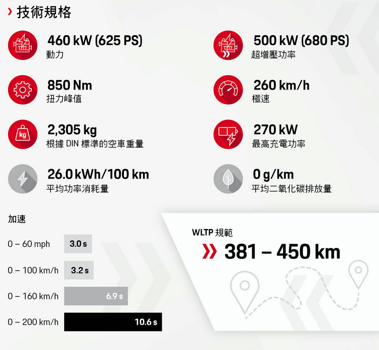 性能與效能![]() ▲相較一般電動車配備 400 伏特動力系統,Porsche Taycan 為首款搭載 800 伏特動力系統的量產車款,創造獨步全球穩定且優異性能表現。結合高達 560 kW 的超增壓功率與彈射起步功能,旗艦車款Taycan Turbo S可輸出動力高達761 PS,Taycan Turbo 則為680 PS;Taycan Turbo S 可在 2.8 秒內完成 0-100 km/h 加速,Taycan Turbo 0-100 km/h 加速則可在 3.2 秒內完成。Turbo S 車型續航力高達 420 公里,Turbo 車型則超過 450 公里(皆符合WLTP 數據),兩款車型極速皆為 260 km/h。
