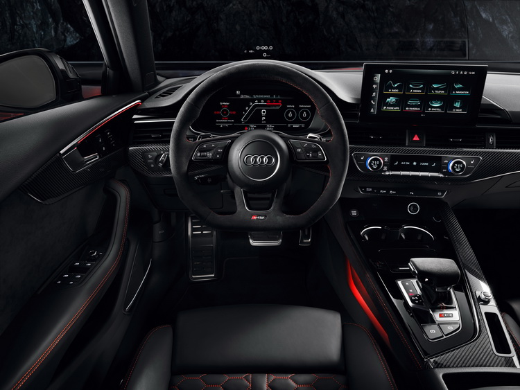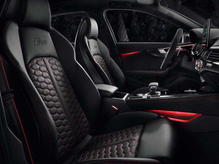 內裝以黑色為主調,配備Nappa高級皮革包覆跑車座椅與平底多功能方向盤等RS專屬配備。並可在座椅、方向盤、車門檻與排檔座等處看到RS字樣。RS版AUDI全數位化虛擬座艙也列為標配。