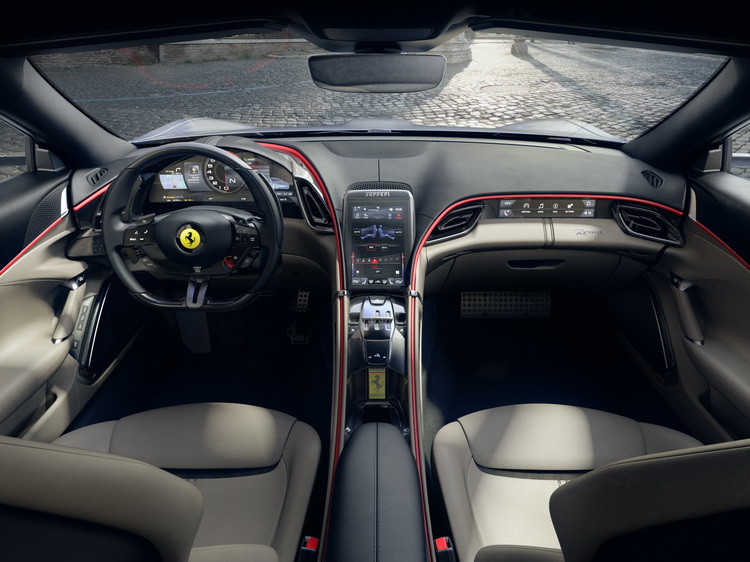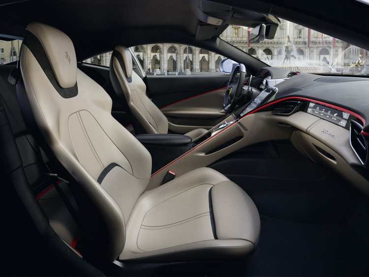 採前中置引擎配置的Roma車身尺碼為車長:4656mm、車寬:1974mm、車高:1301mm,軸距:2670mm,車重為1472公斤。車艙內,駕駛座與副手座有著明確地包圍感,內裝則以全粒面的高級皮革、Alcantara類麂皮、碳纖維、鍍鉻加工鋁合金等材質來鋪陳。新開發的方向盤導入了multi-touch controls觸控鍵介面,讓駕駛者手不用離開方向盤即可操作多項車內功能。