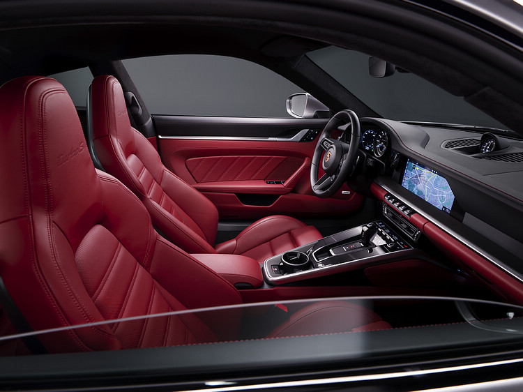 ![]() 內裝亦呈現頂級的跑車質感,標準配備項目包括全皮革包覆內裝、淺銀色碳纖維裝飾;十八向電動調整跑車座椅,縫線細節致敬史上首部911 Turbo車型(Type 930);儀錶板呈現高畫質車型輪廓與車標字樣突顯Turbo S車型特色;Porsche通訊管理系統(PCM)配置10.9吋中央螢幕,全新版面規畫可讓駕駛者無須分心地快速操作。