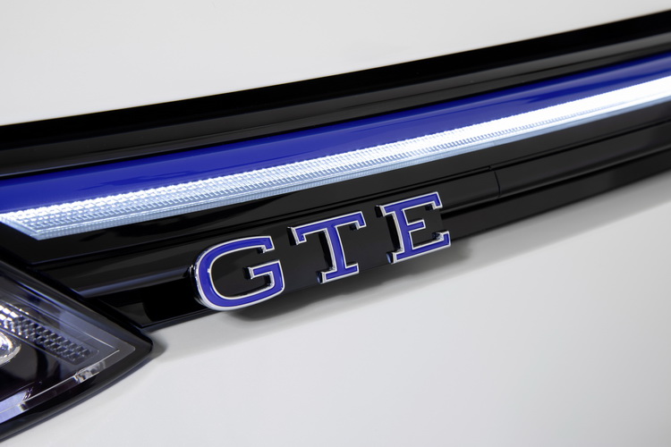 Golf從上一代開始首度在車系中加入GTE車型這位新成員,大改款後的新Golf也延續VW的電動化戰略持續推出GTE車型加入家族之中。新Golf GTE外觀上配備大型網格狀的前保桿,左右側頭燈則透過LED光條的連結帶來一體感,並且以細長的藍色勾邊來強調其「環保車」的形象。整個車頭感覺也比較接近性能版的GTI車型。當開啟日行燈或車主拿著鑰匙走近車輛時,藍色LED光條就會亮起。