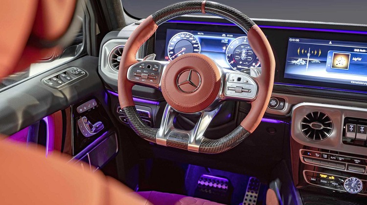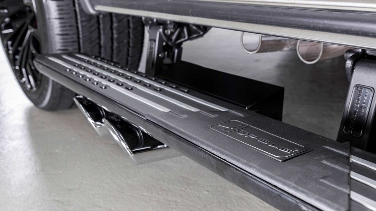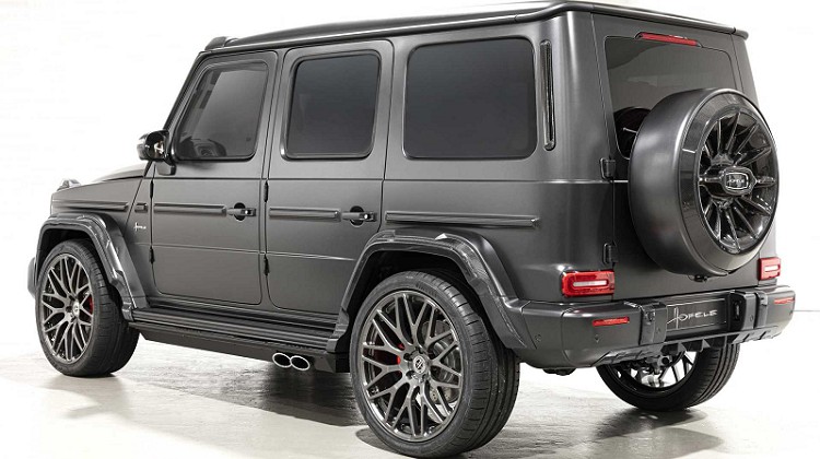 首先Hofele在外觀安置了一個全新樣貌的保險桿,該保險桿的進氣口和碳纖維裝飾周圍有深色的鍍鉻飾條,營造出一種特殊的氛圍。前後的外擴輪弧換上碳纖維製品,搭配消光黑色車色,顯現出低調的不凡。另外,前擋風玻璃上方裝有一組LED燈,並提供深色鍍鉻、碳纖維和車身同色的飾條妝點。車尾還有一個碳纖維的備胎蓋,全尺寸24吋規格鋁圈採用雙輻設計。Hofele還提供獲得專利的可電動展開、收折側面踏板,方便乘客上下車使用,並且保留G63側面排氣管,飾管會隨著側踏板連動,不然會被踏板給擋住。