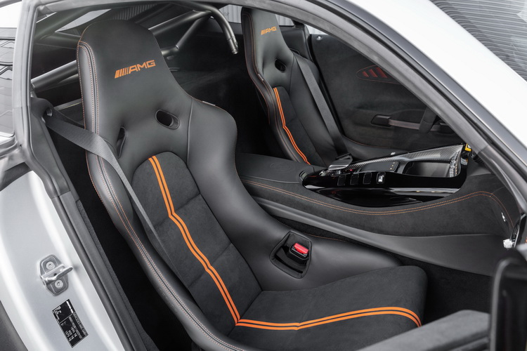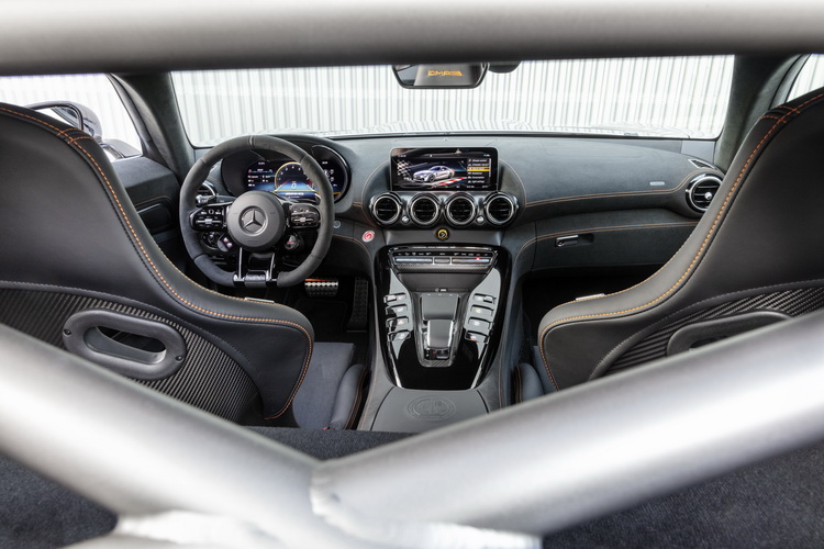 當然,車室內也少不了專屬銘牌與內裝飾板來與其他GT車型區隔。駕駛座前方有漂亮的AMG Performance方向盤,座椅與中央鞍座也有雙排橘色或銀色條紋/縫線來與整體的黑內裝搭配。