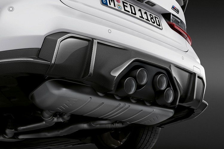 BMW將提供全新M3與M4將近三十種不同的M Performance性能套件,首先針對M3與M4的排氣系統做重要的升級項目,該系統在後方碳纖維擴散器中間改為中置四出尾管,與原廠的左右雙出有很大不同。從照片中看到實際安裝會有種震撼感,這是BMW性能車款很少出現的排氣布局,我們大膽假設,這樣的配置會相同轉移在M4 GTS進階性能車型上。BMW表示,這組排氣系統採用鈦合金打造,並且具閥門可隨時控制排氣聲浪與暢通性。