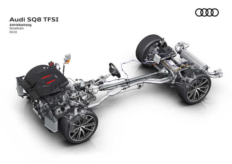 SQ8汽油版標配all-wheel steering四輪轉向系統,透過電動轉軸與連桿讓後輪轉向,在低速域時後輪會向與前輪反方向轉最多五度來提高轉向的靈活度。高速時則最多可與前輪同向轉1.5度,在變換車道時提昇車子的動態穩定度。