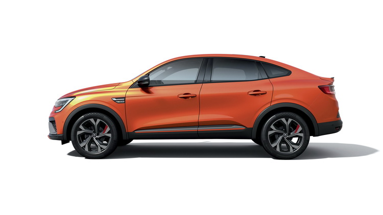 Arkana有著傾斜角度大且呈平緩弧線的車頂線條,腰線位置較高,前、後保線桿也給人比較寬闊、厚實的感覺。「C」字形LED線條的頭燈則是近來在RENAULT家族中的共同設計元素。車身尺碼上,Arkana車長:4568mm、車寬:1821mm、車高:1571mm、軸距:2720mm。車身距地高度186mm,寬闊的輪拱中配備著17吋輪胎。除了車身輪廓線條外,車側下緣的鍍鉻護條與車頂的環景天窗也都進一步修飾出它的Coupe-SUV風格。