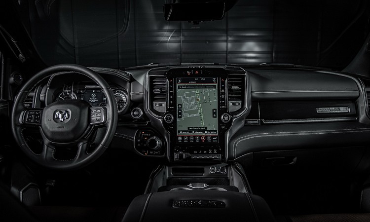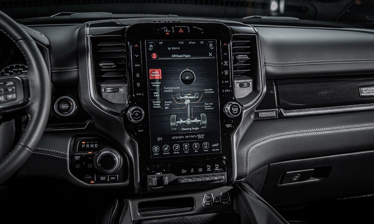 前排標準兩張運動座椅,棕色的皮革內飾並看得到Power Wagon 75的專屬銘牌,中控台採用黑色皮革待配上亮黑色飾板,中間12吋多功能顯示幕,所有功能都由此介面操作,另外影音娛樂系統配上Harman Kardon揚聲器,對於皮卡來說絕對是最大享受。另外,螢幕裡的功能還包括360度環景、越野模式調整、顯示車身越野狀態等。