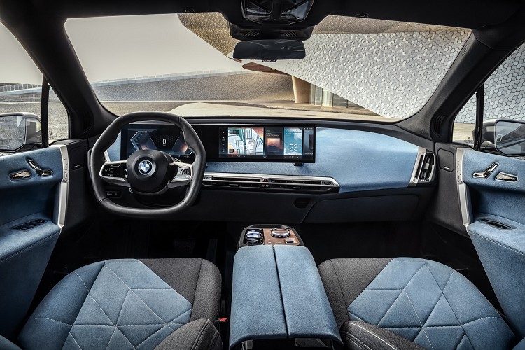 精心打造的中控台,看起來像家裡所擺設的高檔家具,中央鞍座上看得到iDrive旋鈕,當然使用上會雷同現行車型上系統,可由此操作前方屏幕的任何功能,當然使用者也能選用觸控屏幕的方式。在iX車內,可以看到大量使用水晶點綴操作按鍵,精簡後的整體更能突顯出水晶所帶來的高質感車室饗宴。