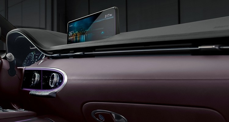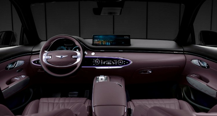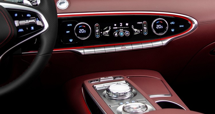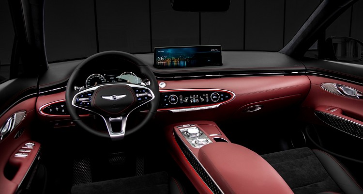 簡約的駕駛艙包括一個雙層的儀表板,中控台上方有為固定式螢幕,下方的冷氣空調介面以小螢幕顯示。GV70沒有大量簡化按鍵,還是可以看到按鍵被規劃在中控台橢圓形樣貌之中。中央鞍座上有控制螢幕的旋鈕,排檔桿型式也為旋鈕介面;全車以高檔皮革包覆,搭配上特殊樣式的飾板,成功的將GV70內裝質感推向高峰。