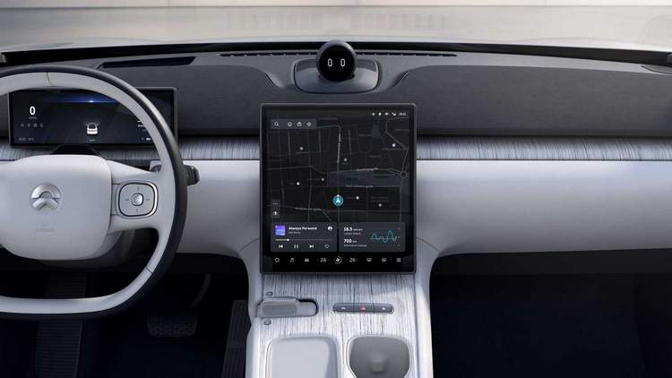ET7搭載第二代數位化座艙,導入Qualcomm第三代的「Snapdragon」車用運算平台來強化與行動裝置的連結與通訊機能。中控台上配置12.8吋「AMOLED」高解析度螢幕搭配「NOMI」車載AI系統最新版。音響則是搭載全車共23支揚聲器、總出力100W的7.1.4全景聲音響系統。
