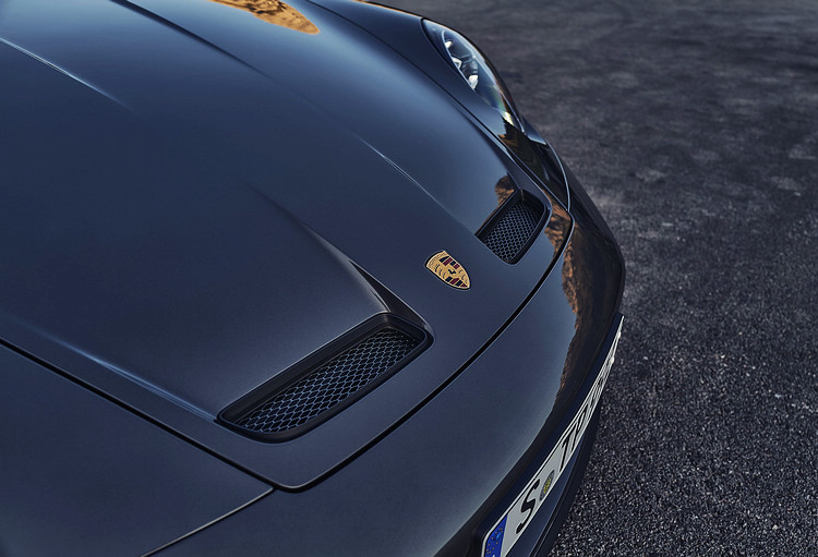 ![]() 後方水箱護罩鑲嵌「GT3 touring」專屬徽飾,亮銀色的飾邊延伸車身兩側直至跑車式排氣尾管,車主亦可憑自身喜好選擇採用消光或高亮澤黑色飾邊,車頭燈組搭配燻黑外罩呈現。