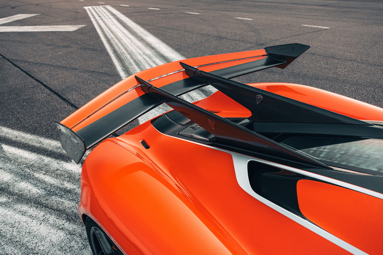 車身後方大型主動式擾流尾翼與分流器確保高速行駛時優異的空力性能;前下擾流也具備主動式襟翼,當車子以275km/h車速行駛時所產生的下壓力達到1000公斤