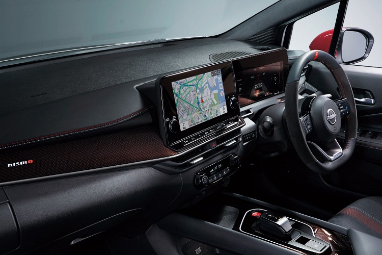 進到車內就如同外觀,黑色車內配色外還利用紅色作為反差視覺特殊氛圍。首先雙前座以換上跑車造型,並有Nismo專屬字樣,如果消費者覺得戰鬥氣息不夠,也可選配Recaro賽車座椅,帶來更好的包覆性。方向盤採用D型樣式,且包覆Alcantara麂皮增加手感,再透過紅色縫線來加深運動感。
