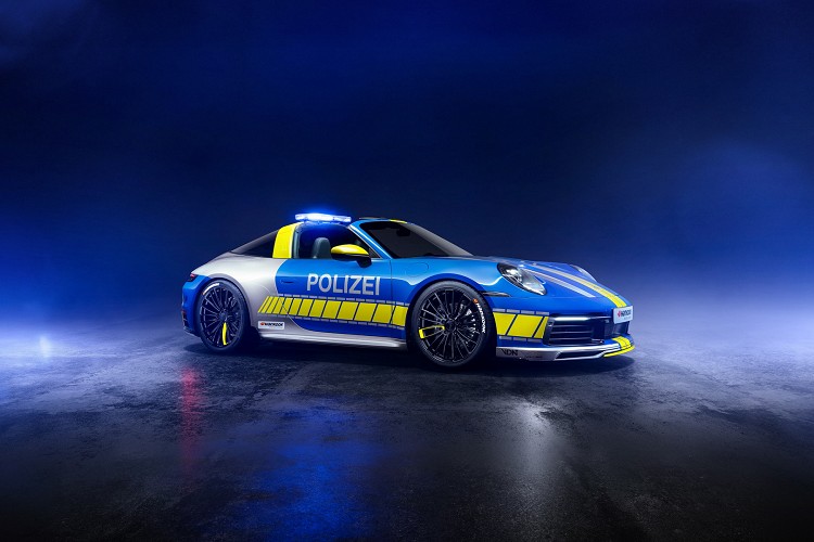 這輛名為Techart Cabriolet的Porsche敞篷車,基礎來自新一代992的911 Targa 4,為符合警車的規範,首先是外觀以藍色、黃色和銀色作為主色調,再加上反光貼紙和醒目"Polizei"字體,整體就與一般警車無太大差異。除了塗裝之外,車頂位置與碳纖維引擎蓋上,額外安裝LED閃燈,這對於警察在值勤時相當重要。