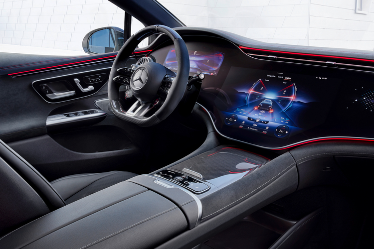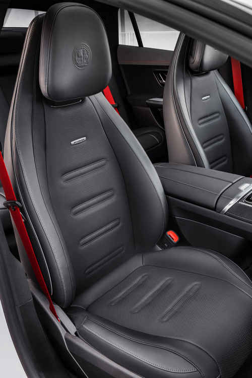 車內同樣滿是強烈的AMG運動風,專用的AMG以MICROCUT超細纖維與ARTICO人造皮革材質搭配紅色縫線。並可選配NAPPA真皮座椅。控台部分使用了NEOTEX智慧織布材質搭配ARTICO人工皮革與紅色縫線包覆。方向盤除了標準AMG式樣外,還可選配附動能回生撥片、平底造型、NAPPA真皮包覆的AMG Performance方向盤。當然,AMG跑車踏板、車室地毯與門檻也都是標配。