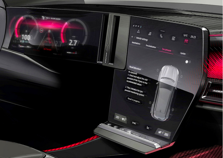 前方控台由12.3吋的數位儀錶顯示幕與12吋的大型中控台觸控螢幕所構成,並為螢幕施予高度抗反光度層處理,無須遮光罩駕駛也能在各種光線條件下清楚閱讀螢幕畫面。