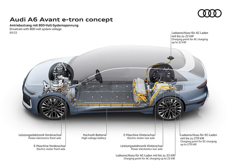 至於這次露臉的A6 Avant e-tron概念車為雙馬達設計,能提供350kW的輸出功率和800Nm的扭力,並且同樣導入強大的 800V電機系統的技術,充電效率可達270kW,單次充電於WLTP標準下的測試續航里程長達700公里,號稱10分鐘即可供電至300公里行駛所需電量,電量5%充電至80%不用25分鐘。而根據原廠公佈的資料,在性能表現上,A6 Avant e-tron單馬達版本0-100km/h加速需時不到7秒,雙馬達車型則在4秒以下。