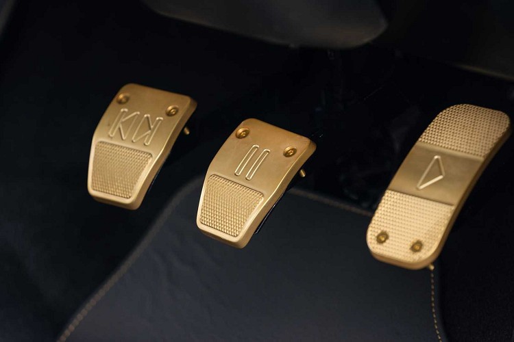 車輛內部,David Brown Automotive延續了Marshall黑色和金色的品牌形象靈感,像是儀錶板、中控台、開關相關設備均採用金色裝飾。另外,在油門、煞車、離合器踏板上,可以看到下一首、播放和暫停的特殊符號,巧妙的在車內融入特殊巧思。車內座椅採用黑色真皮包覆,再藉由撞色金色縫線符合品牌神韻。頭枕處繡有Marshall字體。