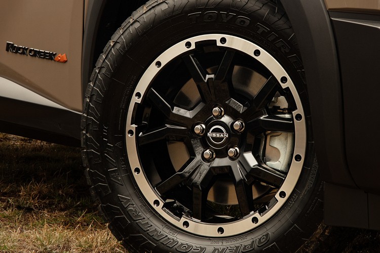 新年式特仕版Nissan Pathfinder Rock Creek外觀最醒目的就是車頭黑色烤漆V型水箱護罩,上方還有專屬探照燈。車頂配置管狀車頂架,方便放置額外物品,最高可乘載100公斤;車尾有專屬Rock Creek的銘牌,保桿下方維持霧面黑色防刮材質。輪胎使用18吋防脫胎款式鋁圈以及全地形輪胎,足以應付大多數路況。車身顏色有六種可以選,另外還有四種雙色調搭配。