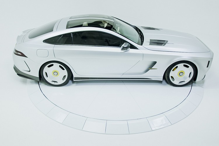 從外觀看上去,便可以知道它屬於一輛大型GT跑車,而基礎來自於AMG GT 4 Door車款。車頭運用上G-Class的方正概念,左右兩邊頭燈簡直如出一轍;引擎蓋則可看到與SLS相同的進氣孔,長車頭、短車尾比例完美複製。原本四門設計的AMG GT 4 Door被捨棄後門配置,前門的開機構也改成與勞斯萊斯類似的馬車式結構,如此大膽的想法完全符合will.i.am的個性。